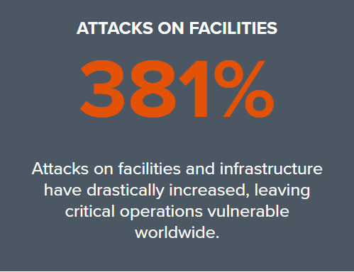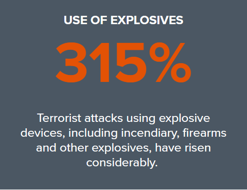 While the number of terrorism events is generally decreasing, there has been a severe increase in particular types of events. Man-made threats to commercial targets and critical infrastructure have increased exponentially, resulting in a surge in demand to protect assets from bad actors.